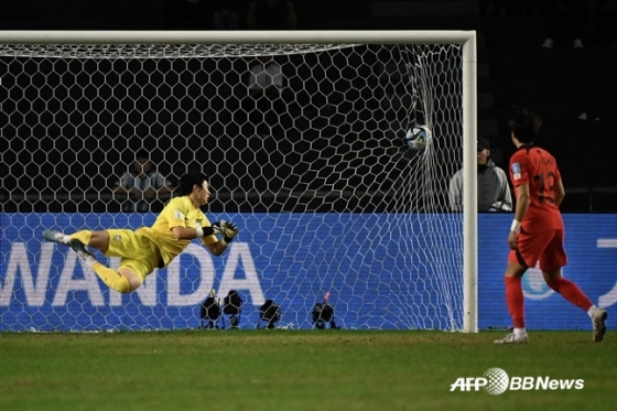 이런 침착함이 통했다. 한국이 9분 만에 페널티킥(PK) 동점골을 터트리며 균형을 맞췄다. 전반 18분 차노티가 배준호의 발을 밟고 손으로 밀어 넘어뜨렸다. 주심은 비디오판독(VAR) 후 PK를 선언했다. 키커로 나선 이승원이 강력한 오른발슛으로 골망을 흔들었다. 상대 골키퍼가 방향을 잡았지만 슛이 워낙 강해 손쓸 수 없었다.