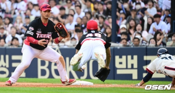 이의리는 환상적인 글러브 토스로 이날 경기 주인공으로 거듭났다. 두산의 하위 타선은 3회에 이어 4회에도 기회를 만들었다. 김재호와 강승호가 연속 안타로 1사 1, 2루 찬스를 잡았고 타석에는 앞서 센스 있는 번트로 빅이닝을 이끈 정수빈.