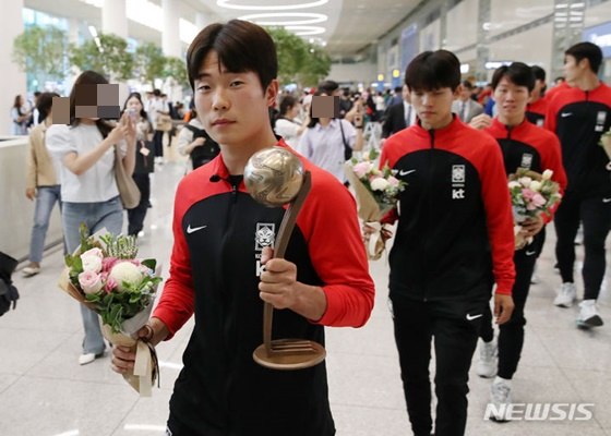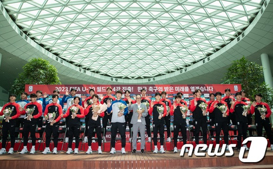 김은중 감독이 이끄는 U-20 대표팀이 14일 오후 인천공항을 통해 귀국했다. U-20 대표팀은 지난 달부터 아르헨티나에서 개최된 2023 FIFA U-20 월드컵 4강 드라마를 완성했다. 다소 무관심한 상황 속에서 출국길에 올랐던 것과 달리 이날 귀국 현장은 뜨거웠다. 많은 축구팬들이 대표팀을 맞이하기 위해 입국 시간 전부터 몰려들었다. 배준호(대전하나시티즌), 김지수(성남FC), 이영준(수원FC), 강성진(FC서울) 등 각자 좋아하는 선수들의 유니폼을 들고 손꼽아 기다렸다. 대표팀 선수들이 모습을 드러내자 300여명의 축구팬들이 뜨거운 함성과 박수를 보냈다. 대표팀 선수들도 손을 흔들며 감사의 마음을 전했다.