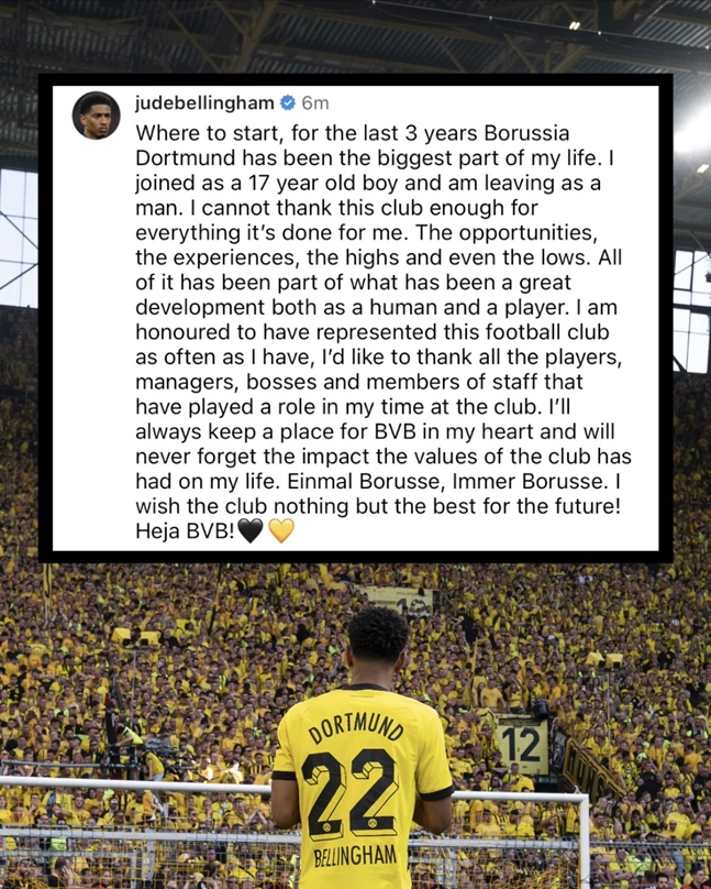 도르트문트도 공식 SNS에 벨링엄의 모습이 담긴 기념 포스터와 함께 '고마워 주드'라는 글을 올리며 작별 인사했다.
