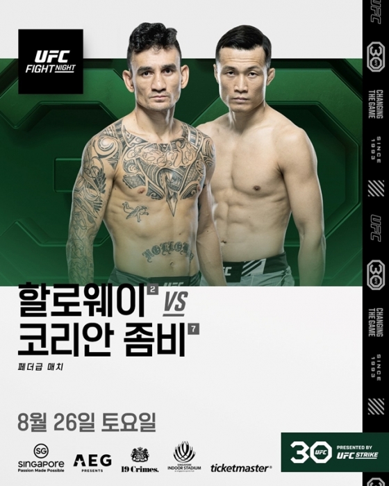 UFC는 16일 "코리안 좀비 정찬성과 전 페더급 챔피언 맥스 할로웨이가 싱가포르에서 맞대결을 펼친다"고 밝혔다. 'UFC 파이트 나이트: 홀러웨이 vs 코리안 좀비'의 메인 이벤트 페더급 경기는 8월 26일 싱가포르 인도어 스타디움에서 펼쳐진다. 이로써 정찬성은 지난해 4월 알렉산더 볼카노프스키와 UFC 페더급 타이틀전 이후 1년 4개월 만에 복귀전을 치르게 됐다.