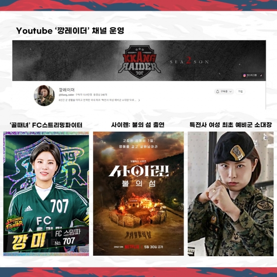 깡미는 8년간 군 생활을 마치고 전역한 국내 최초 특전사 여성 예비군 소대장이다. SBS 골때리는 그녀들을 비롯해 넷플릭스 피지컬 100, 사이렌 불의섬 등 다양한 방송 프로그램에 출연해 군인으로서의 면모를 뽐내기도 했다.