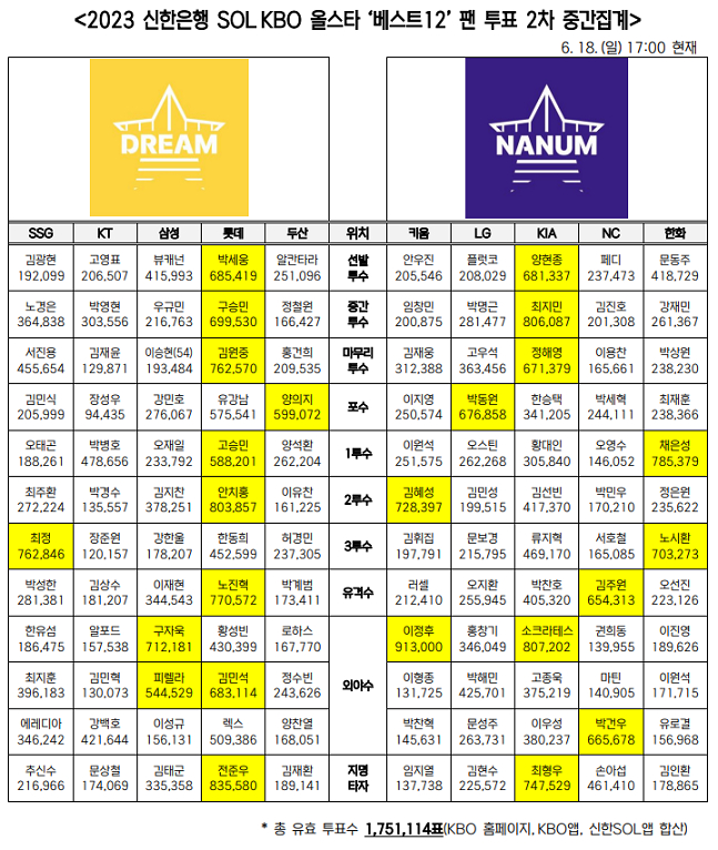 한국야구위원회(KBO)는 19일 2023 신한은행 SOL KBO 올스타전 '베스트12' 팬 투표 2차 중간집계(18일 오후 5시 현재) 결과를 발표했다.
