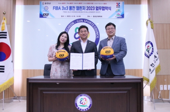 홍천군과 홍천군체육회, KXO(한국3x3농구연맹)가 'FIBA 3x3 홍천 챌린저 2023'(홍천 챌린저)의 성공 개최를 위한 업무 협약식을 거행했다.