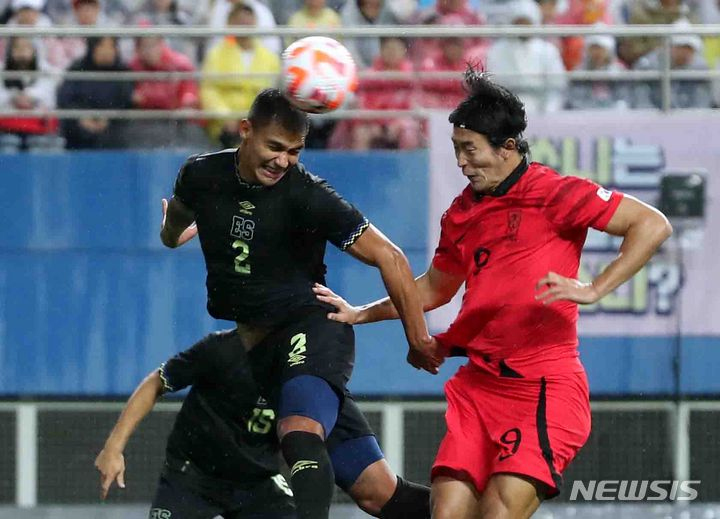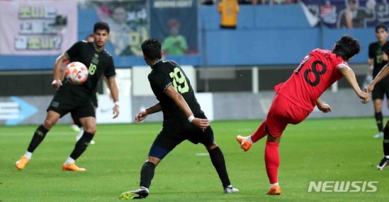 경기가 시작될 즈음에 비가 쏟아지며 수중전이 시작됐다. 초반 분위기는 한국이 완전히 압도했다. 전반 4분 설영우가 재빠른 오버래핑으로 오른쪽 측면을 파고든 뒤 전방으로 쇄도하는 이재성을 향해 패스했다. 이어 이재성이 페널티박스 안에서 오른발 슛을 때렸지만 골키퍼가 몸을 날려 겨우 쳐냈다.