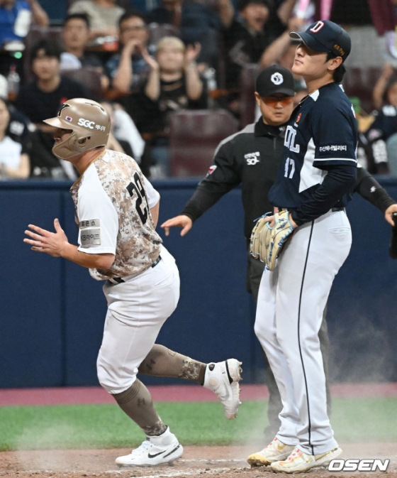 정철원이 등판했으나 볼카운트 3-0까지 몰렸다. 임지열은 초구를 흘려보냈고 3-1에서 속구에 방망이를 휘둘렀다. 타구를 잡아낸 3루수 허경민은 홈으로 빠르게 공을 뿌렸다. 3루 주자는 포스아웃됐고 양의지는 1루로 공을 뿌렸지만 타자주자 임지열의 등에 맞고 공이 빠져나가며 그 사이 2루 주자가 3루를 거쳐 홈을 밟았다.
