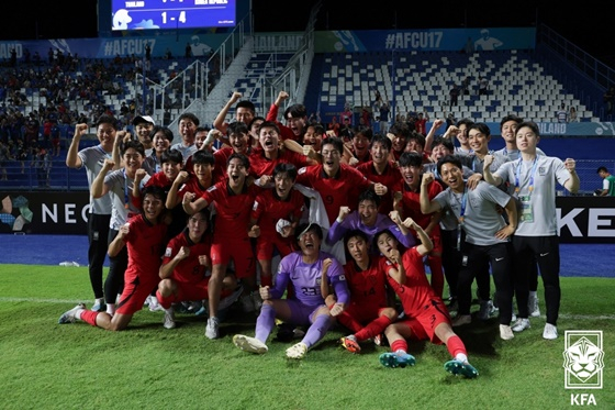 변성환 감독이 이끄는 U-17 대표팀은 26일(한국시간) 태국 빠툼타니 스타디움에서 열린 아시안컵 8강 태국과 원정경기에서 골폭풍을 몰아쳐 4-1 대승을 거뒀다. 강민우의 선제골을 시작으로 김명준, 윤도영, 김현민이 연달아 골망을 흔들었다. 이들은 대표팀 선배들 손흥민(토트넘), 문선민(전북현대)의 시그니처 세리머니까지 선보이며 환하게 웃었다.