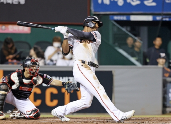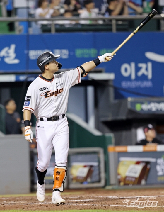 불펜 투수들의 릴레이 호투 속 타선에선 꾸준히 점수를 쌓으며 힘을 보탰다. 7회말 드디어 역전에 성공했다. 1사 주자 없는 상황에서 노시환이 손동현의 가운데로 몰린 시속 144㎞ 속구를 밀어쳐 우측 방면으로 커다란 아치를 그렸다. 5-4 역전포. 개인 시즌 14번째 홈런이자 리그 이 부문 공동 2위로 올라섰다.