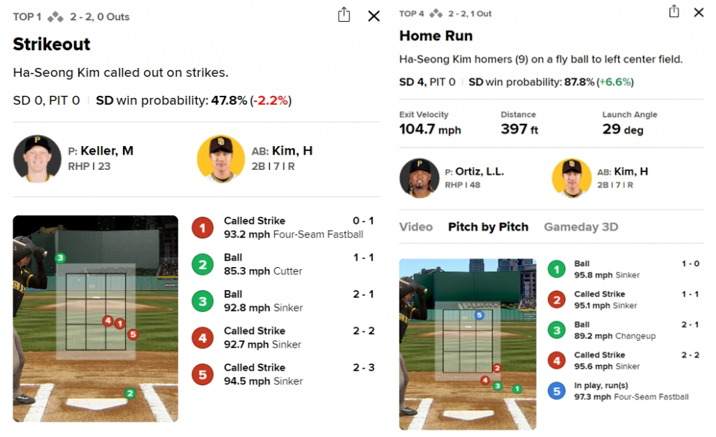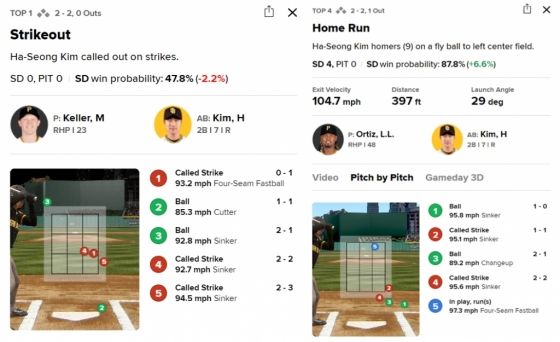김하성의 홈런이 나올 때까지만 해도 샌디에이고의 승리 확률은 87.8%에 달했다. 경기 초중반이긴 했으나 승리 확률을 6.6% 끌어올린 귀중한 홈런포였다.