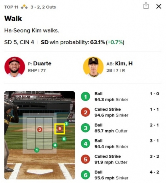 김하성은 싱커와 커터가 주무기인 우완 다니엘 두아르테를 상대로 침착하게 볼을 골라 1스트라이크 3볼의 유리한 볼카운트를 만들었다. 하지만 5구째가 문제였다. 두아르테의 시속 91.9마일 싱커는 바깥쪽으로 크게 빠져 볼이 유력했다. 메이저리그 공식 홈페이지 MLB.com 중계화면 상으로도 5구는 스트라이크존 바깥으로 공 하나는 더 빠져 나와 있었다. 김하성은 황당한 볼 판정에 더그아웃과 주심을 한 번 쳐다봤으나, 항의하지 않고 다시 볼을 골라 볼넷으로 출루했다. 이로써 시즌 출루율은 0.344에서 0.346으로 올라갔고 OPS도 0.755에서 757로 상승했다.