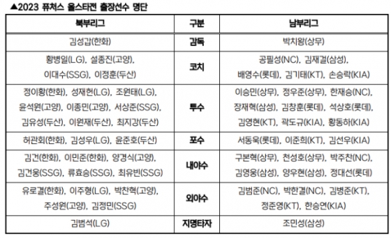 한국야구위원회(KBO)는 14일 부산 사직구장에서 18시에 개최되는 2023 KBO 퓨처스 올스타전 출전선수 명단을 확정했다.