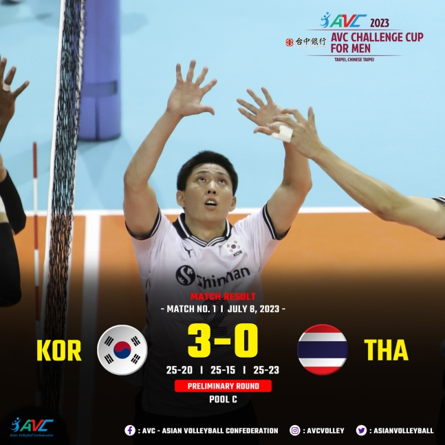 임도헌 감독이 이끄는 한국 대표팀(세계랭킹 33위)은 8일(한국시간) 대만 타이베이 타이베이대학 체육관에서 열린 2023 AVC 챌린지컵 조별리그 B조 1차전에서 태국(세계랭킹 60위)을 세트 스코어 3-0(25-20 25-15 25-23)으로 완파했다.