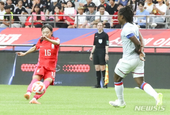 이날 한국은 피지컬을 앞세운 아이티의 공세에 고전했다. 전반에 선제골을 허용하며 분위기를 내줬다. 하지만 한국은 후반전에 완전히 달라졌다. 전반에 보여주지 못한 기동력, 패스가 점차 살아나며 뺏겻던 흐름을 되찾았다. 후반 6분 만에 조소현이 얻어낸 페널티킥(PK)을 지소연이 침착하게 차 넣어 동점을 만들었다.