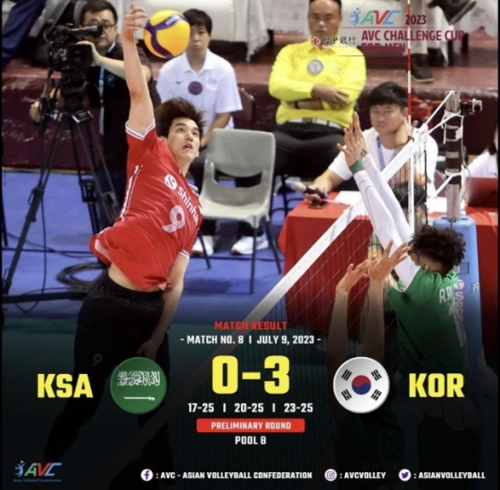 임도헌 감독이 이끄는 한국 대표팀(세계랭킹 33위)은 8일(한국시간) 대만 타이베이 타이베이대학 체육관에서 열린 2023 AVC 챌린지컵 조별리그 B조 1차전에서 사우디아라비아(세계랭킹 없음)을 세트 스코어 3-0(25-17, 25-20, 25-23)으로 완파했다.