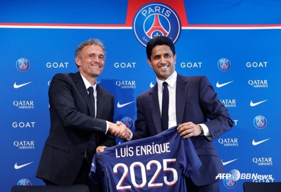 PSG의 루이스 엔리케(왼쪽) 감독이 지난 6일(한국시간) 기자회견에서 카타르 출신의 나세르 알 켈라이피 회장과 악수하고 있다. /AFPBBNews=뉴스1