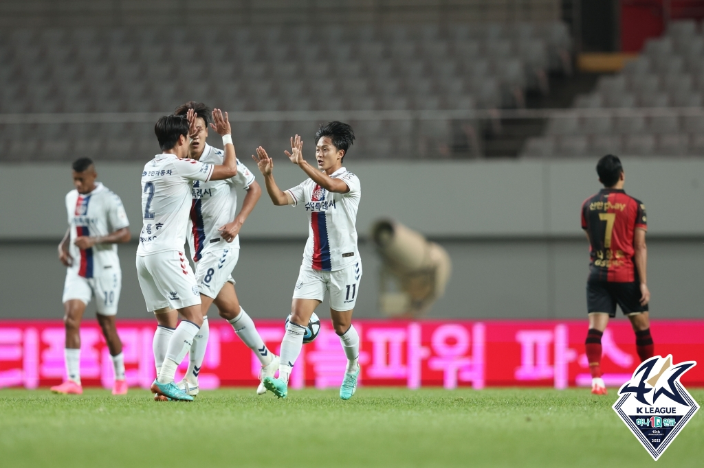 수원FC가 2분 만에 추가골을 터트리며 순식간에 점수를 2-4로 만들었다. 후반 7분 이광혁이 왼쪽 측면에서 중앙으로 돌파해 수비 뒷공간으로 쇄도하는 이승우에게 전진 패스를 찔러줬다. 이승우가 논스톱 슈팅으로 연결해 리그 3호골을 터트렸다.