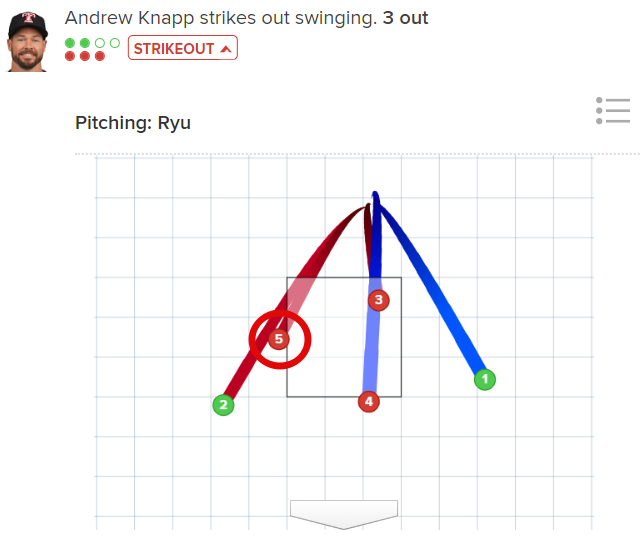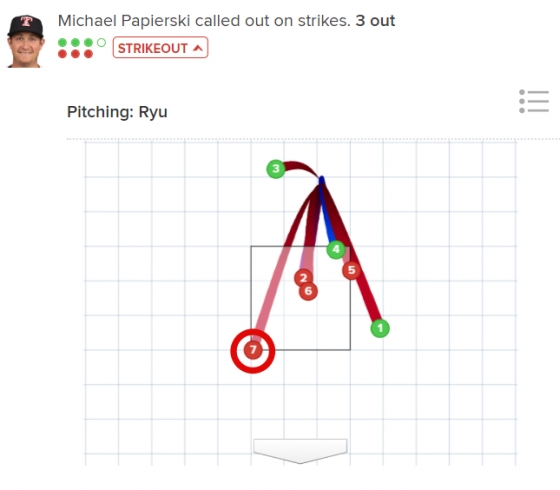 그리고 5회초. 류현진은 다시 한번 삼자 범퇴로 기개를 뽐내며 이날 자신의 투구를 마무리했다. 선두타자 샌즈를 중견수 뜬공, 후속 파피에르스키 역시 우익수 뜬공으로 각각 유도했다. 이어 냅을 볼카운트 2-2에서 5구째 빠른 공을 절묘하게 존에 걸치게 몸쪽으로 꽂으며 헛스윙 삼진으로 돌려세웠다.