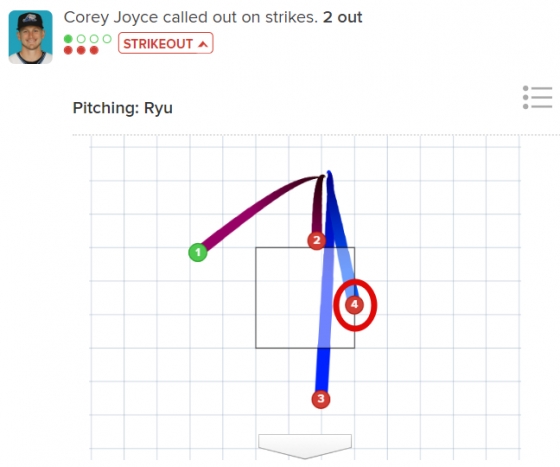 류현진은 3회 역시 삼자 범퇴로 상대 타선을 깔끔하게 처리했다. 선두타자 앤드류 냅을 3구째 유격수 땅볼 아웃시킨 뒤 코레이 조이스를 4구 만에 루킹 삼진으로 얼어붙게 했다. 이번에도 스트라이크 존 바깥쪽에 절묘하게 걸친 공이 인상적이었다. 다음 타자 미도우는 좌익수 직선타 아웃. 이닝 종료.