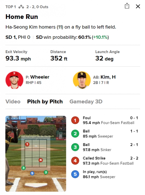 1회초부터 김하성의 방망이가 매섭게 돌았다. 필라델피아 우완 선발 잭 휠러의 5구 스트라이크 존 아래로 꺾이는 시속 86.1마일(138.6㎞) 스위퍼를 잡아당겨 좌측 담장을 넘겼다. 비거리 107m, 타구속도는 150㎞에 달했다.