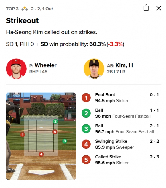 3회초 스트라이크 판정은 다소 아쉬웠다. MLB 공식 홈페이지 MLB닷컴에 제공된 그림상으로 스트라이크로 선언된 4구 스위퍼는 존 아래로, 5회 싱커는 존 바깥을 통과한 것처럼 보였으나 둘 모두 스트라이크가 선언됐고 김하성은 루킹삼진으로 물러났다.