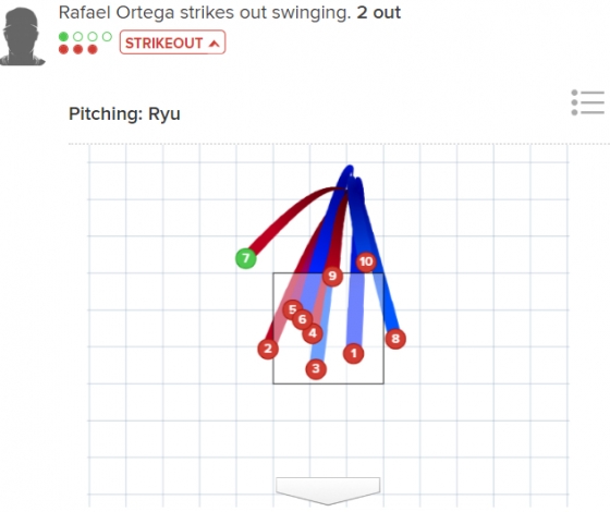 2회는 삼자 범퇴로 더욱 기세를 올렸다. 선두타자 조나단 아라우즈와 후속 라파엘 오르테가를 연속 헛스윙 삼진으로 돌려세웠다. 이어 루크 리터를 3루 땅볼로 아웃시키며 2회를 가볍게 삭제했다.