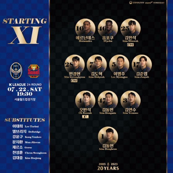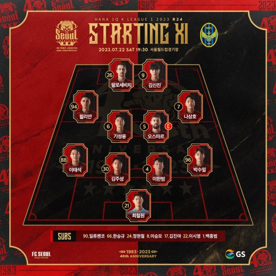 서울은 4-4-2 포메이션을 가동했다. 팔로세비치와 김신진 투톱에 윌리안이 왼쪽 윙어, 나상호가 오른쪽 윙어로 출격했다. 중원은 기성용과 오스마르가 지켰다. 포백은 이태석, 김주성, 이한범, 박수일이 섰다. 골키퍼 장갑은 최철원이 꼈다.