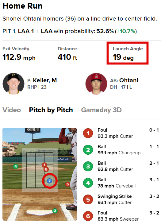 오타니 쇼헤이(29·LA 에인절스)가 19도의 낮은 탄도를 그린 타구를 쐈는데, 그대로 홈런으로 연결됐다. 오타니의 괴력을 바탕으로 한 빠른 타구 속도가 나왔기에 가능한 홈런이었다.