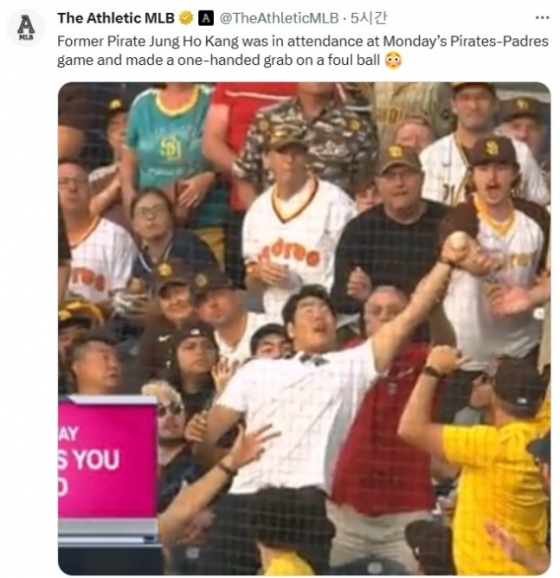 미국 매체 '디 애슬레틱 메이저리그'는 25일(한국시간) 공식 SNS에 "전직 피츠버그 파이어리츠 선수 강정호가 관중으로서 피츠버그-샌디에이고전을 찾았다. 그리고 그는 한 손으로 파울볼을 잡아냈다"고 관중 강정호의 활약상을 조명했다.