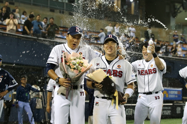 경기 후 꽃다발을 받은 이승엽 감독은 선수들로부터 물세례까지 받은 뒤 관중들과 인사를 나눴다. 한참 뒤에야 취재진과 만난 이승엽 감독은 "경기를 마친 뒤 전광판에 두산 베어스 최초 11연승이라고 뜨는 걸 보니 실감이 났다. 선수들과 하이파이브 하는데 11연승을 진짜 했구나 생각이 들어 기분이 좋더라"고 소감을 밝혔다.