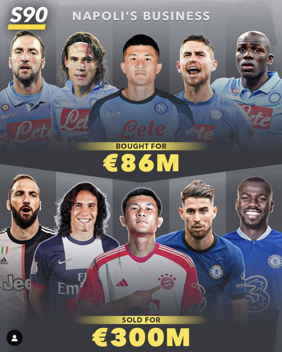 이 선수들을 팔면서 나폴리가 번 돈은 무려 3억 유로(한화 약 4,233억 원)이다. 3배가 넘는 이익을 챙긴 나폴리다.