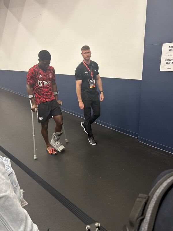 마이누는 맨유 유스 출신으로 이번 프리 시즌동안 잠재력을 인정받았다. 지난 아스널과 친선 경기에선 1,700억의 몸값을 자랑하는 라이스를 상대로 압도하는 활약을 펼쳤다. 맨유는 다음 시즌 미드필드진에 힘을 실어줄 수 있는 선수인 만큼 부상이 조심스럽다.