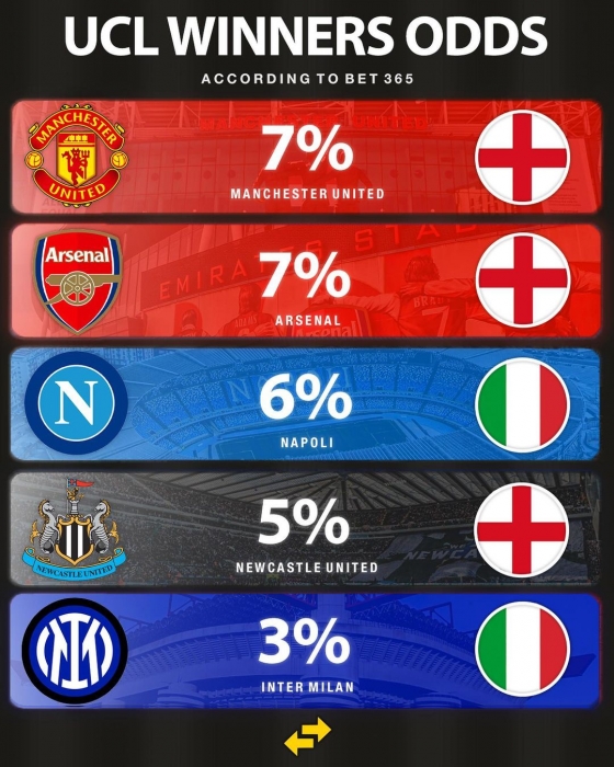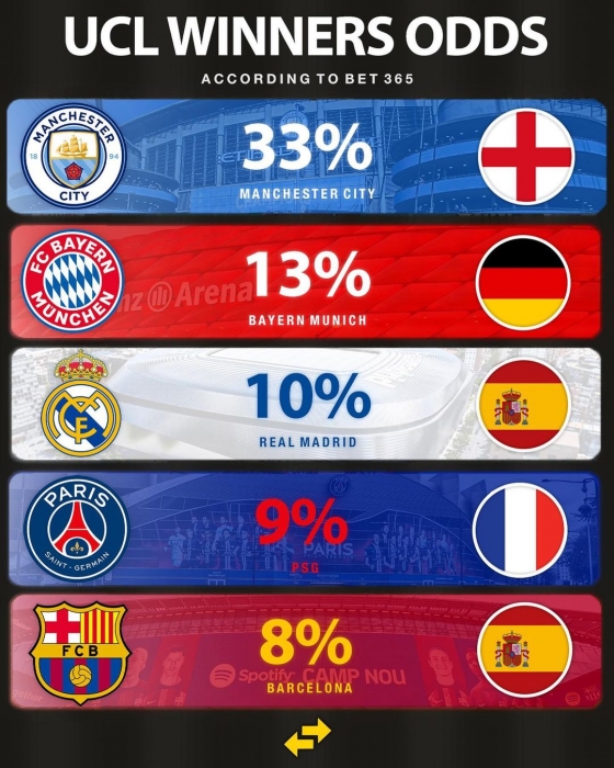 축구 콘텐츠 제작소 ‘stn,daily’는 28일 베팅 사이트 ‘BET 365’의 정보를 활용해 2023/23시즌 유랍축구연맹(UEFA) 챔피언스리그(UCL) 우승 확률을 공개했다.