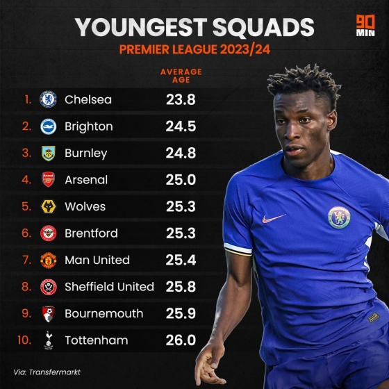 영국 매체 ‘90min’은 지난 30일(현지시간) 2023/2024시즌 앞두고 잉글리시 프리미어리그(EPL) 20팀들의 스쿼드 나이를 나열했다. 가장 어린 스쿼드 10팀을 선정했다.