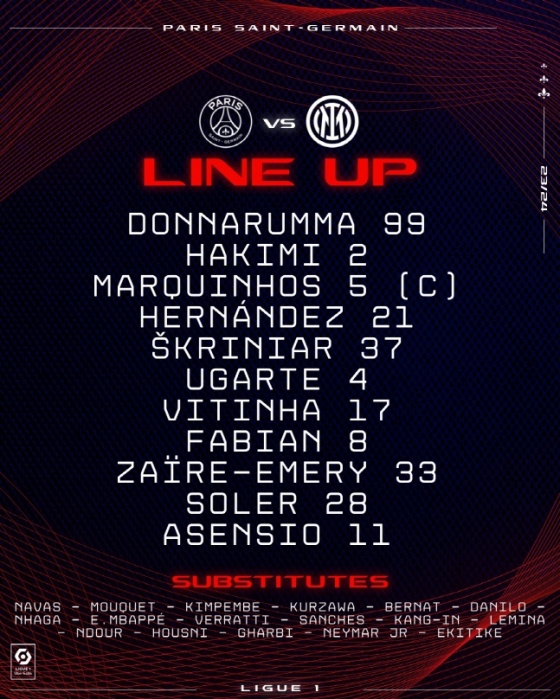 이강인과 네이마르는 벤치에 나란히 앉아 있었다. 이 둘 없이 PSG는 경기를 시작했다. 루이스 엔리케 PSG 감독은 와렌 자이레-에메리, 마르코 아센시오, 카를로스 솔레르가 최전방 3톱 뒤로 비티냐와 마누엘 우가르테, 파비안 루이스를, 수비진엔 아슈라프 하키미와 마르퀴뇨스, 뤼카 에르난데스, 밀란 슈크리니아르를 세웠다. 골키퍼 장갑은 잔루이지 돈나룸마가 꼈다.