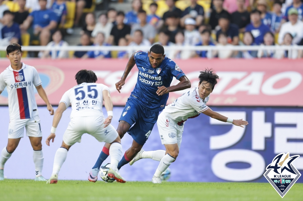 수원FC는 5일 오후 7시 수원월드컵경기장에서 열린 '하나원큐 K리그1 2023' 25라운드 원정 경기에서 라스와 이승우의 연속골에 힘 입어 수원 삼성을 2-0으로 꺾었다.