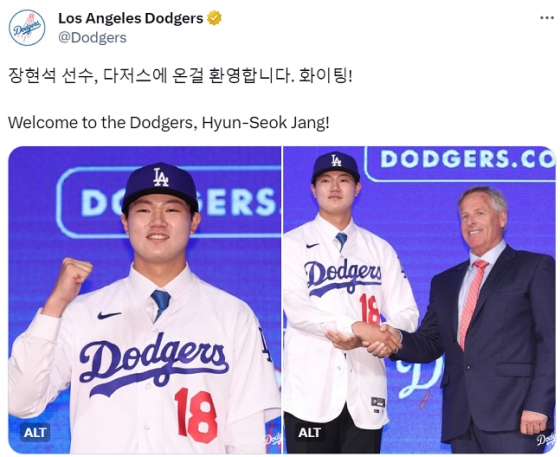 다저스는 15일(한국시간) 구단 공식 SNS에 전날 있었던 장현석의 입단식 사진을 올리며 "장현석 선수, 다저스에 온걸 환영합니다. 화이팅!"이라는 문구를 남겼다.