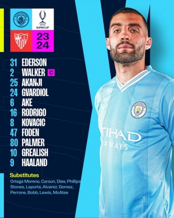 맨시티는 지난 17일 오전 4시(한국 시간) 그리스 피레아스 오르오스 카라이스카키스 스타디움에서 열린 2023 UEFA 슈퍼컵에서 세비야와 1-1로 비긴 뒤 승부차기에서 5-4로 승리하며 정상에 올랐다.