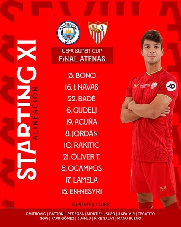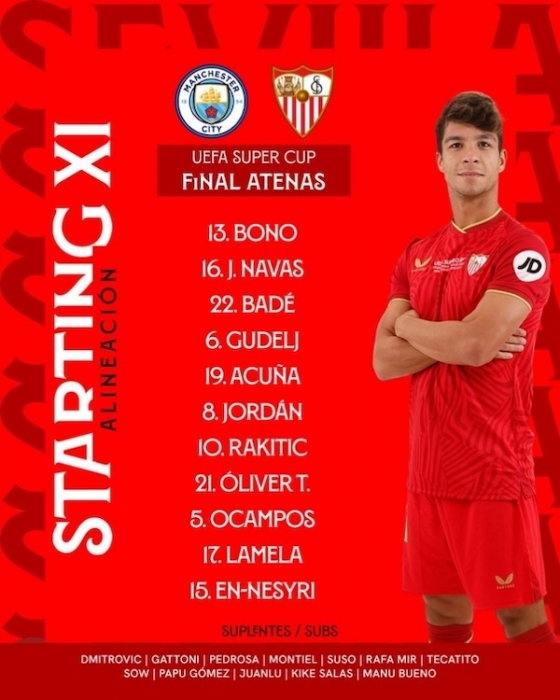 세비야는 4-2-3-1 포메이션을 가동했다. 원톱에 유세프 엔네시리가 출격했다. 2선엔 에릭 라멜라, 올리베르 토레스, 루카스 오캄포스가 섰다. 이반 라키티치와 호안 호르단이 수비진을 보호했다. 마르코스 아쿠냐, 네마냐 구델, 로익 바델, 헤수스 나바스가 포백에서 호흡을 맞췄다. 야신 부누가 골키퍼 장갑을 꼈다.