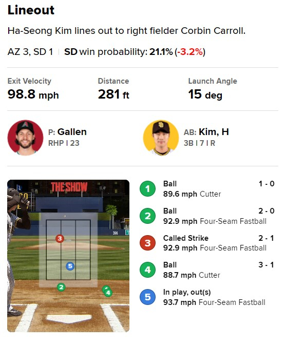 3회엔 2사 2루에서 타석에 섰다. 2-1 유리한 카운트에서 4구 90.1마일(145㎞) 컷패스트볼(커터)이가 몸 쪽을 훑으며 존으로 향했다. 김하성은 적극적으로 방망이를 휘둘렀고 잘 맞은 타구가 좌익수 방면으로 뻗었지만 다시 한번 팜의 글러브에 빨려들어갔다.