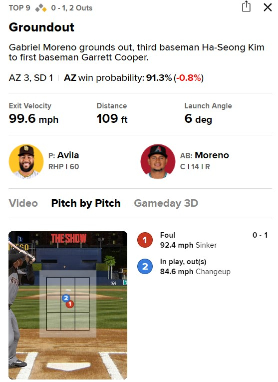 9회초엔 첫 타자 크리스티안 워커의 땅볼 타구를 침착히 잡아내며 아웃카운트를 늘렸고 2사 1루에선 가브리엘 모레노의 이어 총알 같은 타구도 완벽히 잡아내 1루로 송구, 위기를 지워냈다. 타구 속도가 무려 99.6마일(160.3㎞)에 달했다.