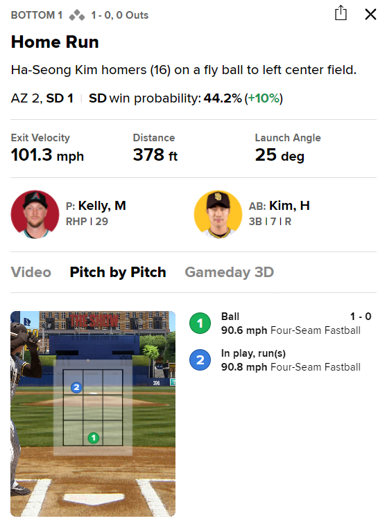 김하성이 추격의 고삐를 당겼다. 1회말 선두타자로 나선 김하성은 'KBO 역수출 신화' 켈리를 상대로 1구 낮은 볼을 지켜봤다. 2구 째엔 공격적으로 나섰다. 시속 90.8마일(146.1㎞) 포심 패스트볼이 몸 쪽으로 높게 제구됐고 김하성의 방망이는 세차게 돌았다. 타구는 시속 101.3마일(163㎞)의 속도로 115m를 비행했고 좌중월을 훌쩍 넘겼다.