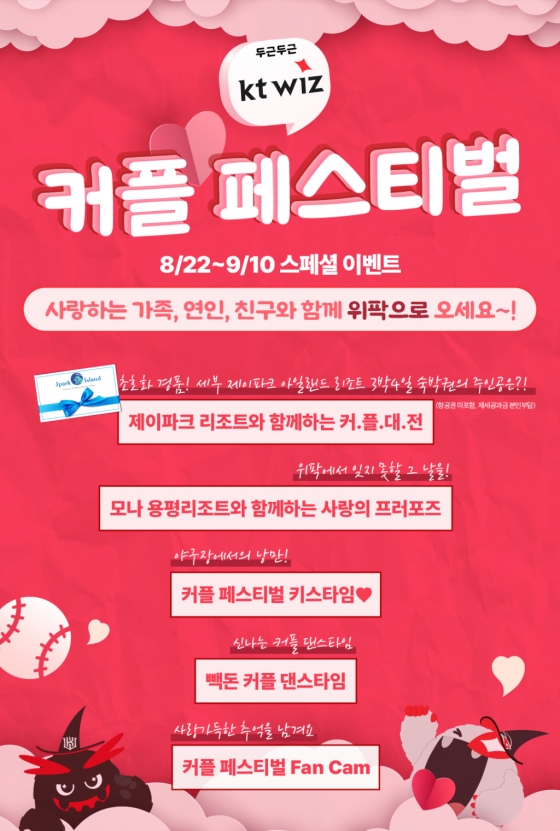 KT는 "오는 22일 KIA전부터 9월 10일 LG전까지 수원 KT위즈파크에서 열리는 홈 12경기에 kt wiz 커플 페스티벌을 진행한다"고 20일 밝혔다.