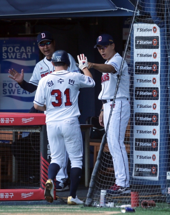 전날 수비 과정에서 허벅지 부상을 당한 정수빈의 이탈이 뼈아팠다. 이승엽 두산 감독은 경기 전 "(정수빈은) 내일까지 쉬어볼 것이다. 경기 후반에 대타 정도는 가능하다고 한다. 상황을 봐야 할 것 같다. 웬만하면 무리를 시키지 않을 생각"이라며 "뛰다가 올라온 게 아니고 공을 맞아 멍든 부위가 조금 올라온 것이기 때문에 그 부분을 조금 지켜봐야 될 것 같다"고 전했다.