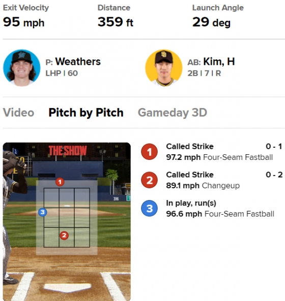 김하성을 향한 2구째. 이번에는 가운데에서 낮은 쪽으로 떨어지는 89.1마일(143.4km) 고속 체인지업이 곡선 궤적을 그린 채 스트라이크 존 안으로 들어왔다. 이번에도 스트라이크 선언. 앞서 높은 공을 그냥 지켜봤던 김하성이 순식간에 0-2의 불리한 볼카운트로 몰렸다. 김하성은 잠시 타석을 벗어난 뒤 한 차례 숨을 고르며 다시 타격 자세를 취했다. 어쩌면 불리한 볼카운트에 몰리면서 밸런스를 잃을 수도 있었던 상황. 그러나 김하성은 달랐다. 3구째. 웨더스의 3구째 몸쪽 96.6마일(155.4km) 포심 패스트볼이 김하성의 몸쪽을 향해 제대로 파고들었다. 이를 본 김하성은 지체없이 배트를 휘두르며 정타를 맞혔고, 타구는 좌측 외야를 향해 쭉쭉 뻗어나간 뒤 그랜드슬램으로 연결됐다. 지난 2021년 메이저리그에 진출한 김하성이 3시즌 만에 데뷔 첫 만루홈런을 작성한 순간이었다. 더불어 김하성은 최희섭(1개)과 추신수(4개), 강정호(2개), 최지만(2개)에 이어 메이저리그에서 만루 홈런을 때려낸 역대 5번째 한국인 타자가 됐다. 김하성은 KBO 리그에서 2014년부터 2020년까지 7시즌을 활약하는 동안 4차례 만루 홈런을 날린 바 있다.