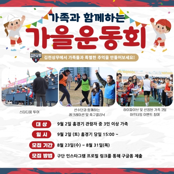 [스포탈코리아] 반진혁 기자= 김천상무가 오는 9월 2일 열리는 가족과 함께하는 가을운동회에 참가자를 모집한다.