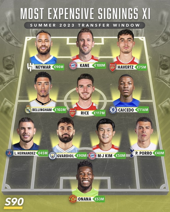 지난 22일(한국 시간) 축구 매체 ‘score90’은 2023년 여름 이적 시장 동안 가장 높은 이적료를 기록한 베스트 11을 공개했다. 비싼 만큼 이름값도 화려했다.