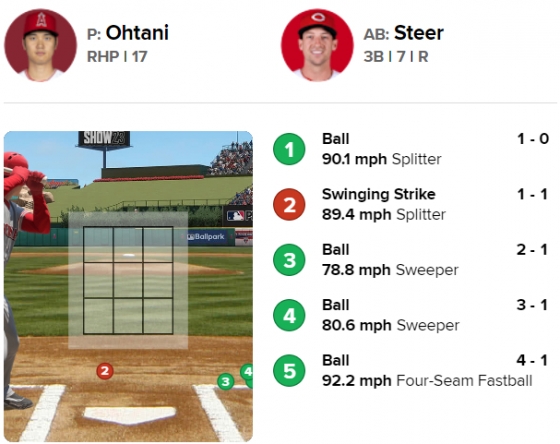 오타니는 자신의 홈런으로 어깨를 가볍게 하면서 다시 2회 마운드에 올랐다. 하지만 선두타자 스티어를 상대하는 과정부터 심상치 않았다. 갑자기 제구가 흔들리는 모습을 보인 것. 모든 공이 스트라이크 존 안에 들어오지 않은 채 포수가 잡지 못하는 등 바깥쪽으로 완전히 빠지고 만 것. 오타니는 볼카운트 1-1에서 볼 3개를 연달아 던지며 결국 첫 볼넷을 내줬다.