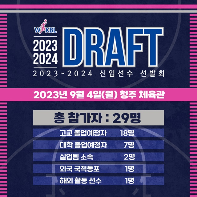 '2023~2024 WKBL 신입선수 선발회'는 오전 10시 지명 순번 추첨식과 오후 3시에 선발회 행사가 진행된다. 유튜브 '여농티비', 네이버 스포츠, WKBL 통합 애플리케이션(앱)을 통해 생중계된다.