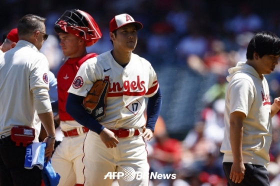 기쁨도 잠시 곧 악재를 마주했다. 2회 마운드에 오른 오타니가 첫 타자 스펜서 스티어를 상대로 연속해서 빠진 공으로 볼넷을 내주며 이상함이 감지됐다. 뒤이은 조이 보토를 유격수 뜬 공으로 돌려세우긴 했으나, 오타니는 벤치를 향해 신호를 보냈고 LA 에인절스 코치와 트레이너가 통역 및 포수와 함께 마운드에 올랐다.