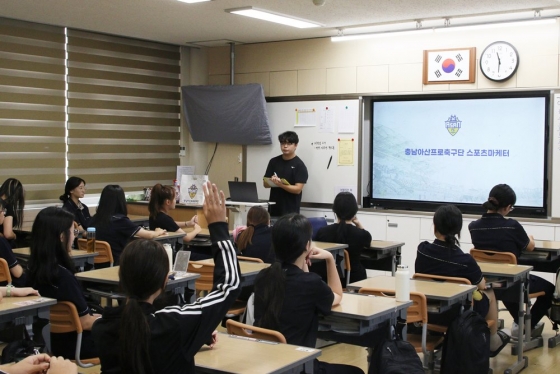[스포탈코리아] 한재현 기자= 충남아산FC가 지난 24일 아산시 관내에 위치한 온양여자중학교(이하 온양여중)를 방문해 청소년진로멘토링 ‘100인 100색’ 프로그램을 진행했다.